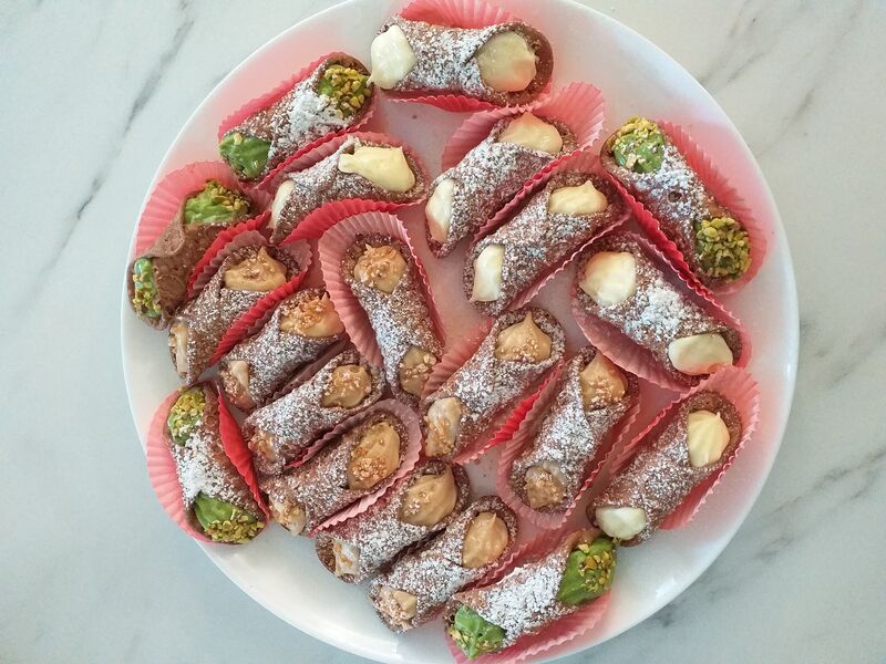 Cannoli siciliani mit Chantillycreme, Nusscreme und Pistaziencreme